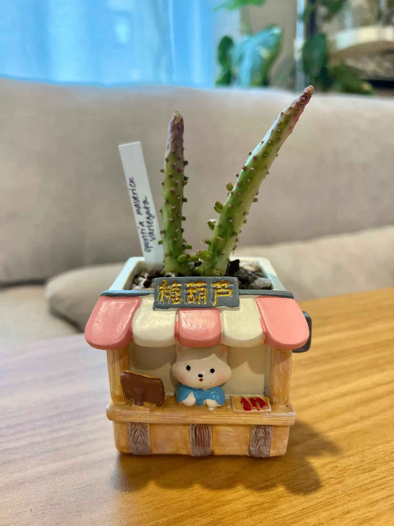 Cute bear figurine at small market stall planter with pink flowers and greenery, Germiant decor