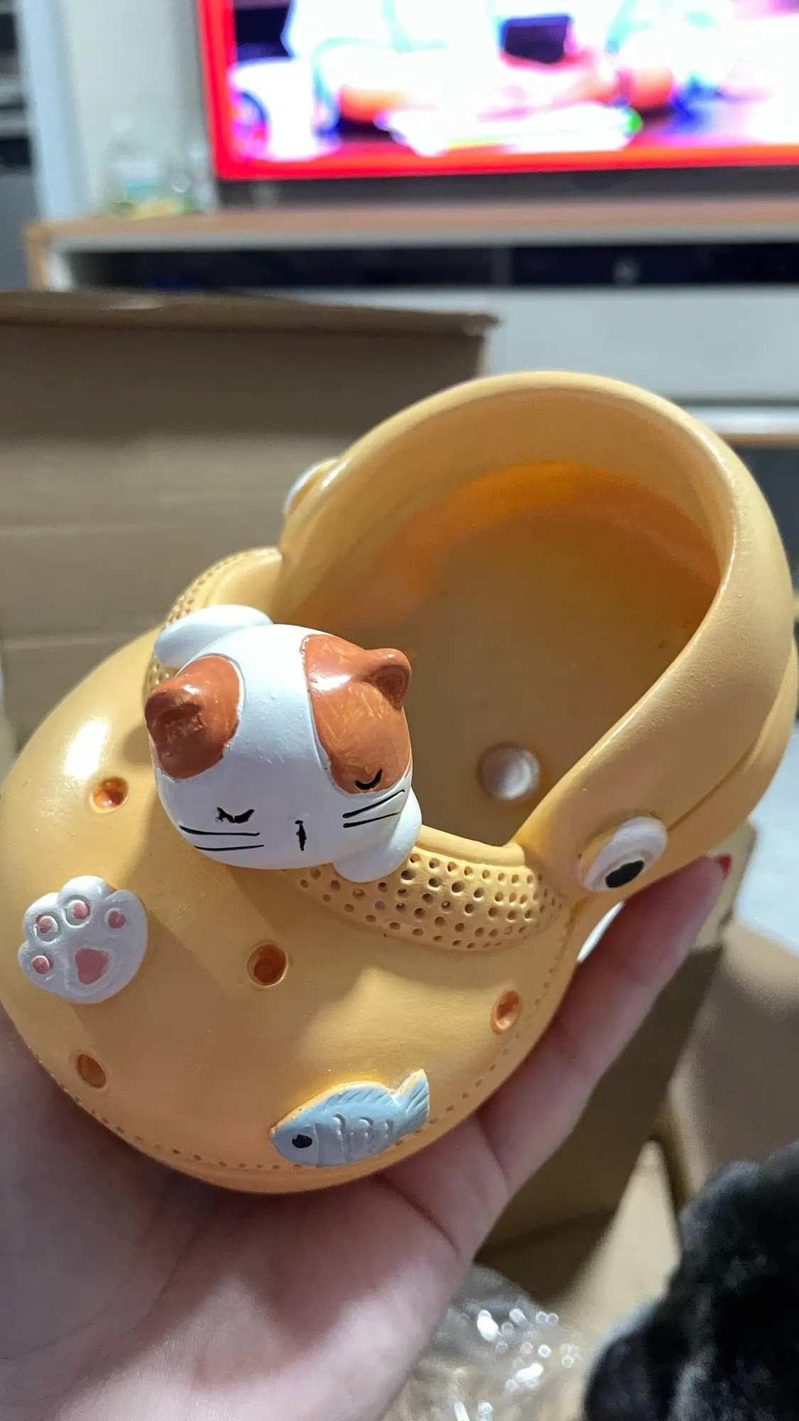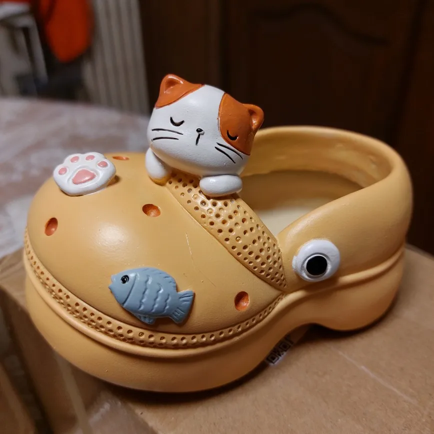 Handbemalte Blumenvase in Form einer Pantoffel-Figur mit süßer Katze, gefertigt aus hochwertigem Kunstharz. Die dekorative Vase ist sorgfältig verarbeitet und eignet sich ideal als stilvolles Wohnaccessoire.