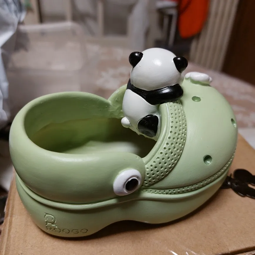 Cute panda planter in green shoe shape with pastel flowers, Germiant decorative home decor
