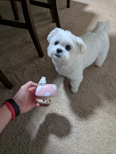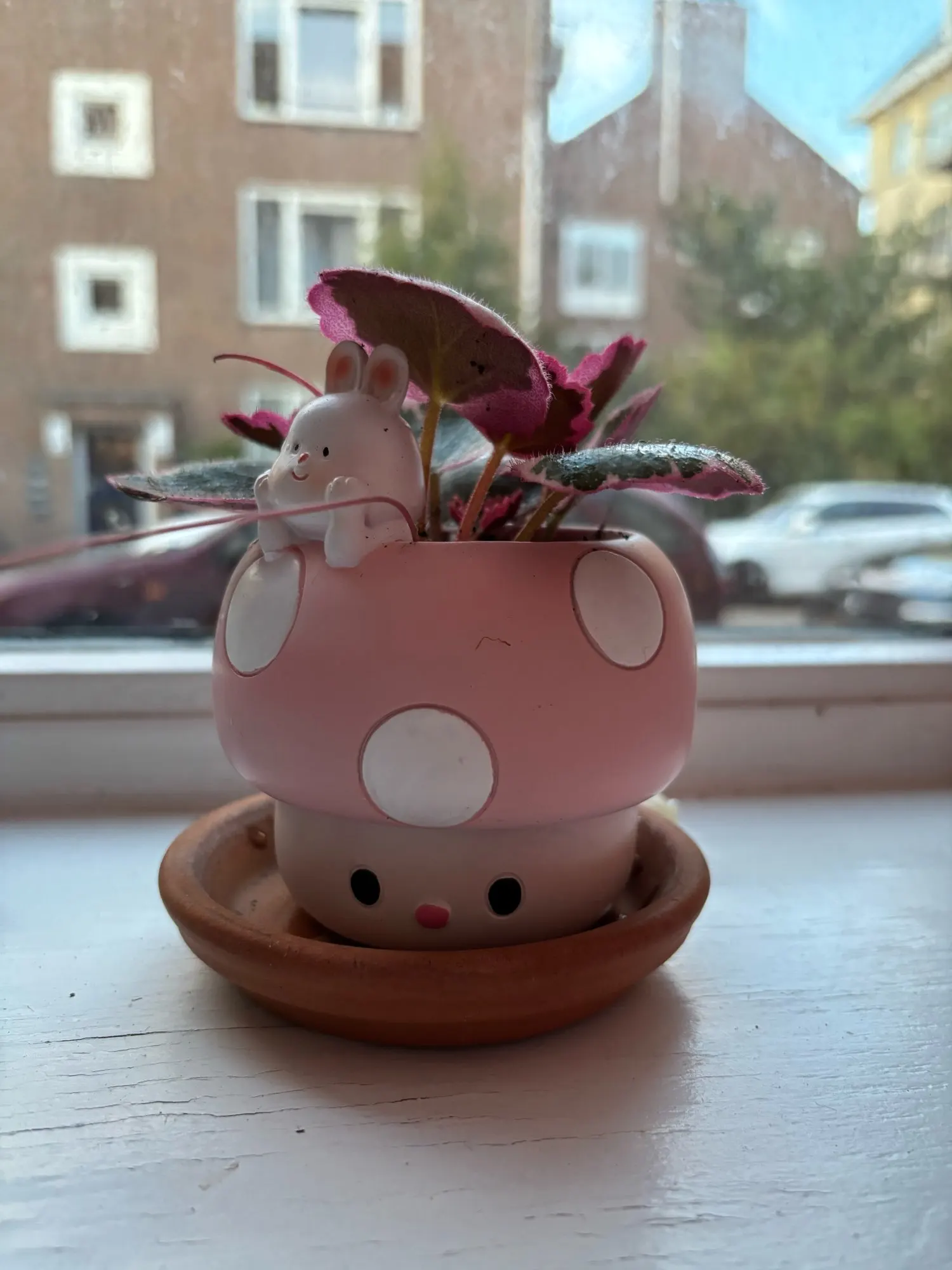Cute pink mushroom-shaped container with a rabbit figure held by hands in a cozy indoor setting.